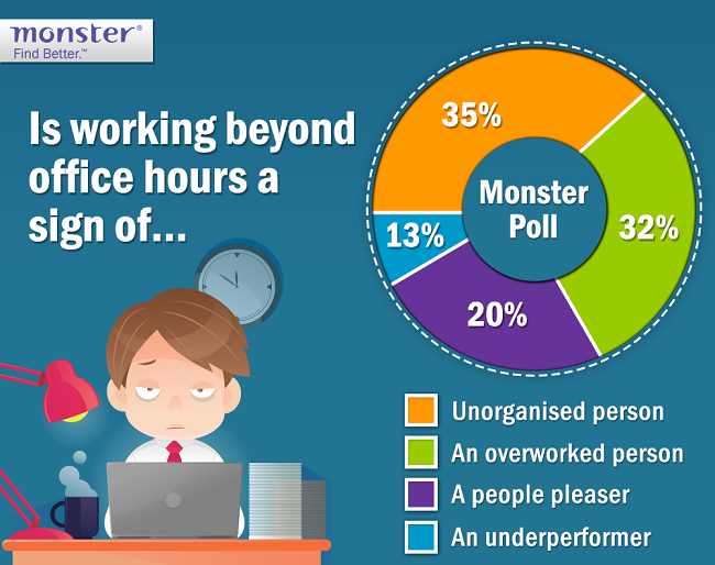 Respondents in a recent Monster poll revealed that working late hours doesn’t score you brownie points. Far from it. As many as 35% of the respondents said working overtime means you’re unorganised, while 32% said it signals you are being overworked. Almost 20% thought a late worker was a people pleaser while 13% thought a person who worked late was a shoo-in for underperformance.